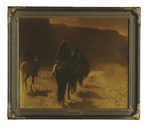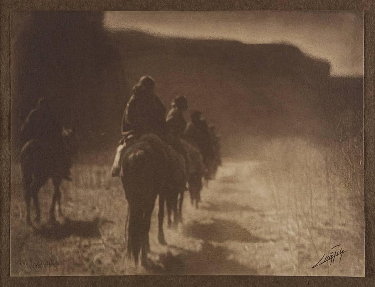 In this platinum print image, curtis captures men on horseback traveling on a remote trail.